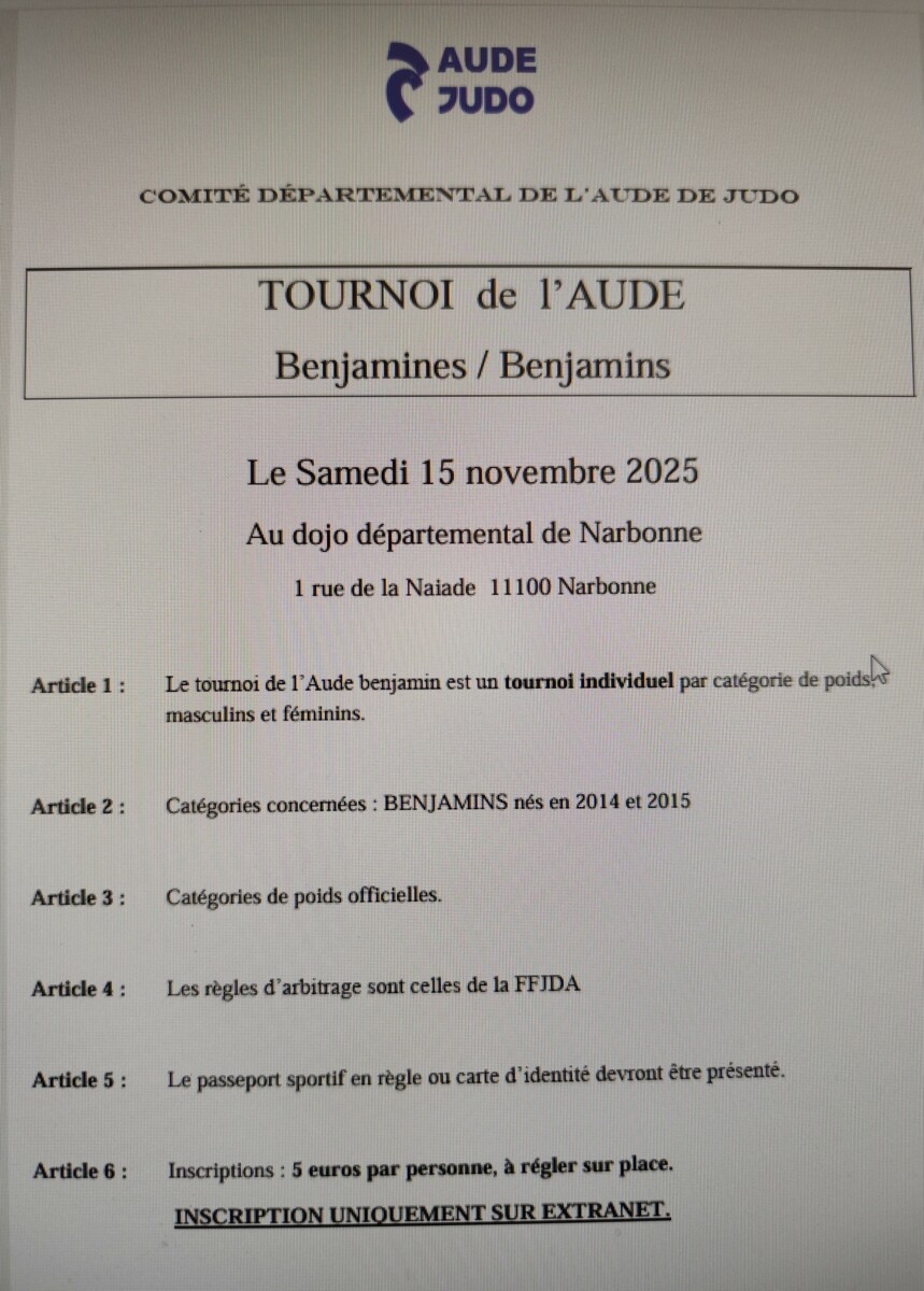 Benjamin -42, -46, -50, -55, -60, -66 et +66 Kg pesée de 10h15 à 10h45