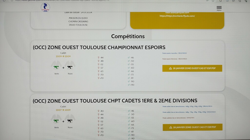 ZONE OUEST TOULOUSE CHPT ESPOIRS _ Cadet - Années de naissance : 2009 ->2009 - Couleurs de ceintures : Verte -> Noire |