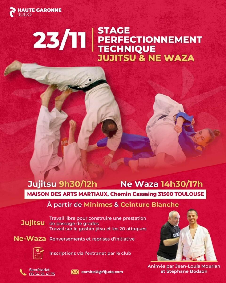 Le samedi 23 novembre à la maison des arts martiaux de Toulouse est dispensé un stage ju-jitsu et ne waza qui est animé par Jean-Louis Mourlan pour le ju-jitsu et Stéphane Bodson pour le ne waza.